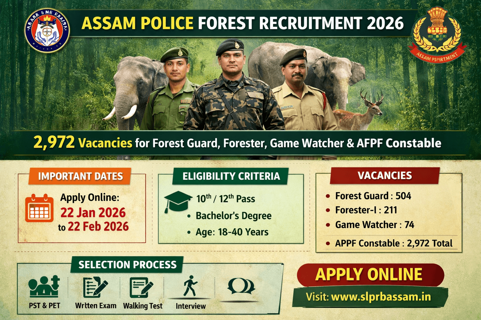 Assam Police Forest Recruitment 2026:- The State Level Police Recruitment Board (SLPRB), Assam has officially released the Assam Police Forest Recruitment 2026 notification for 2,972 posts. The recruitment is for various positions under the Forest Department and Assam Forest Protection Force (AFPF). Interested candidates can apply online through the official website slprbassam.in from 22 January 2026 to 22 February 2026.