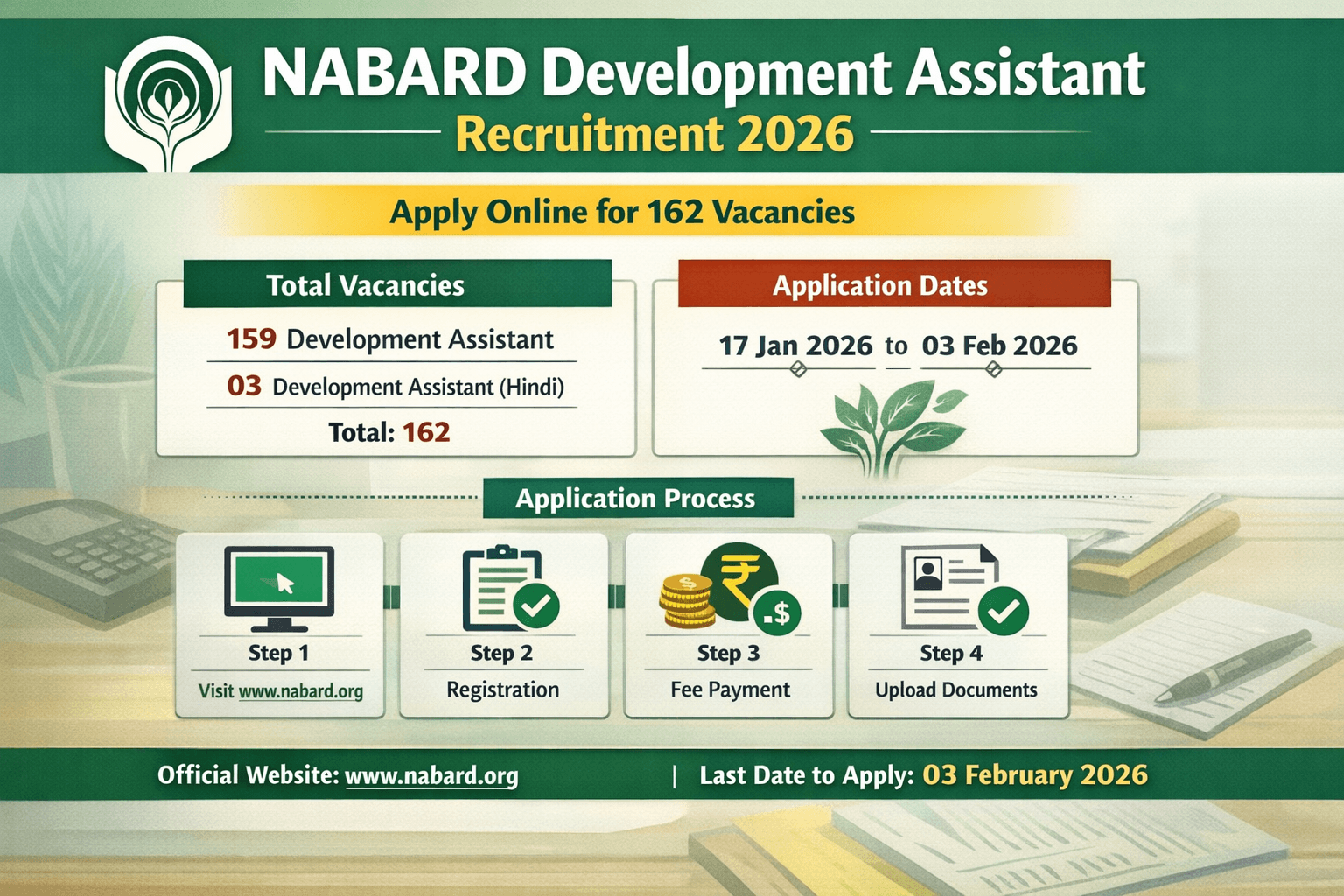 NABARD Development Assistant Recruitment 2026:- The National Bank for Agriculture and Rural Development (NABARD) has released a short notice for the recruitment of Development Assistant posts. Through this recruitment drive, a total of 162 vacancies will be filled. Out of these, 159 posts are for Group ‘B’ Development Assistant and 03 posts are for Group ‘B’ Development Assistant (Hindi).