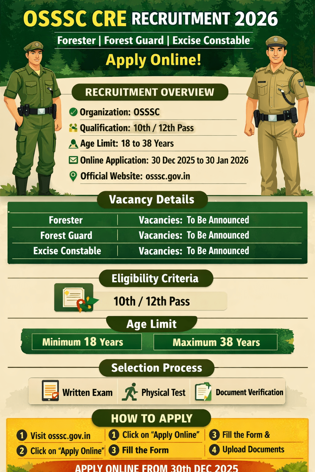 OSSSC CRE Recruitment 2026:- The Odisha Subordinate Staff Selection Commission (OSSSC) has released a short notice for the CRE Recruitment 2026 for the posts of Forester, Forest Guard, and Excise Constable. Candidates who have passed 10th or 12th class are eligible to apply online through the official website osssc.gov.in.