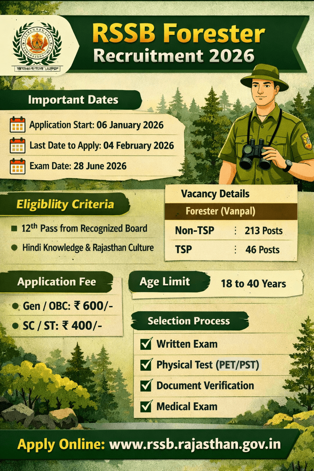 RSSB Forester Recruitment 2026:- The Rajasthan Staff Selection Board (RSSB) has released the official notification for Forester (Vanpal) Recruitment 2026. A total of 259 vacancies have been announced. Eligible candidates who have passed 12th standard can apply online through the official RSSB website.