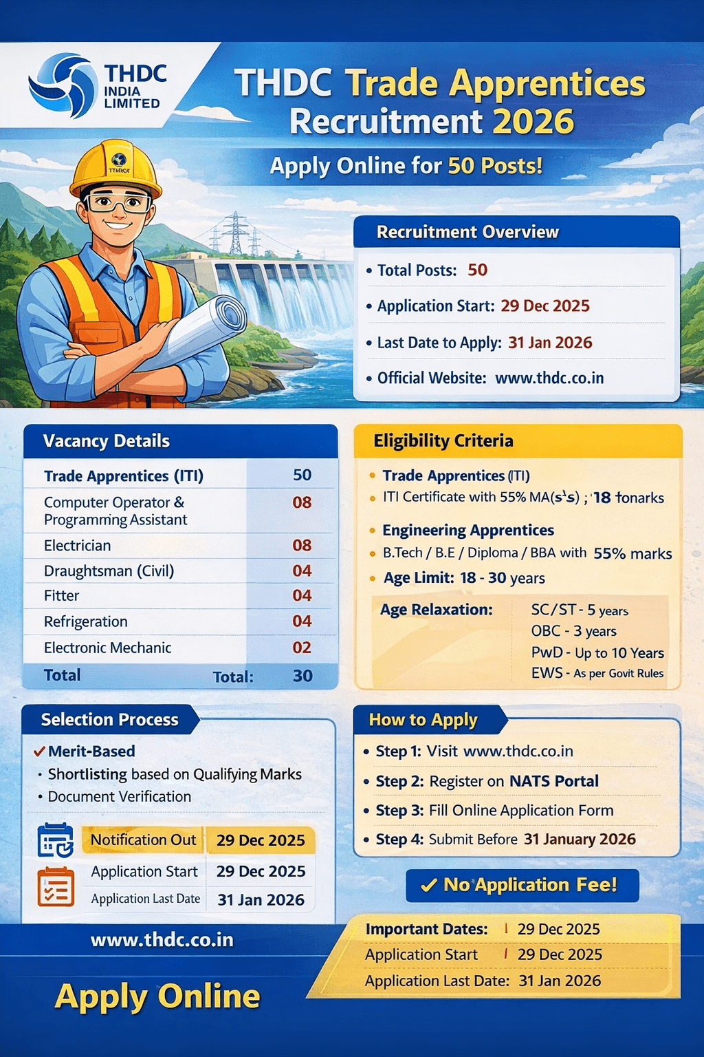 Eligible candidates can apply online through the official THDC website. The online application process started on 29 December 2025 and will close on 31 January 2026.
